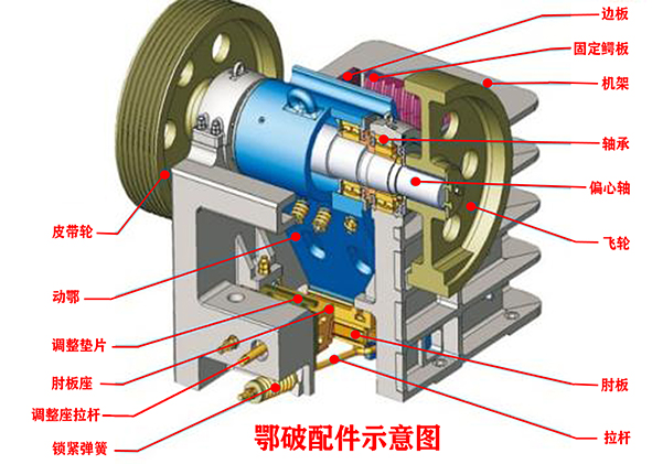 颚式破碎机的工作机构是由动颚和定颚构成的工作腔组成,动颚和定颚承受巨大的破碎力和物料的摩擦作用,容易磨坏,为了保护颚板,一般在动颚和定颚的表面安装耐磨的衬板,这种衬板又称为破碎齿板。破碎齿板的表面通常做成齿形,,破碎板齿峰的角度为90°~120°,其大小由被破碎物料的性质和块度而定,破碎大块物料时,角度要大些;破碎小块物料时,角度可小些。齿距的大小取决于产品的粒度,通常取约等于出料口的宽度,齿高与齿距之比可取为1/ 2~1/ 3。工作时,破碎齿板上下两部分磨损的速度是不一样的,下部比上部磨损得快些,破碎齿板在颚式破碎机工作时,直接与物料接触,承受巨大的破碎力和物料的摩擦作用,破碎齿板的使用寿命直接关系到颚式破碎机的工作效率和生产成本,因此,延长颚式破碎机的破碎齿板的使用寿命就显得尤为重要。延长颚式破碎机破碎齿板使用寿命可以从设计、选材、装配以及使用过程中的改进等方面考虑。